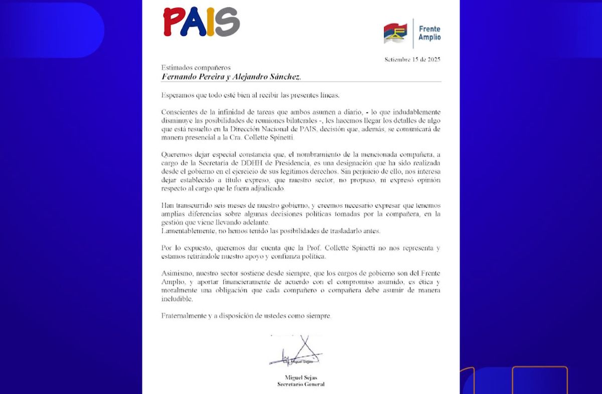 El sector Participación, Acción e Integración Social (PAIS) del Frente Amplio desvinculó de sus filas a Alejandra Spinetti, más conocida como “Colette”, titular de la Secretaría de Derechos Humanos de Presidencia de la República.