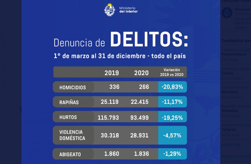 En el caso del mes de diciembre de 2020, y bajo la gestión del Ministerio del Interior a cargo Dr. Jorge Larrañaga, los homicidios bajaron 44,44%, las rapiñas 19,31%, los hurtos 25,06%, la violencia doméstica 18,30% y el abigeato 34,35%.