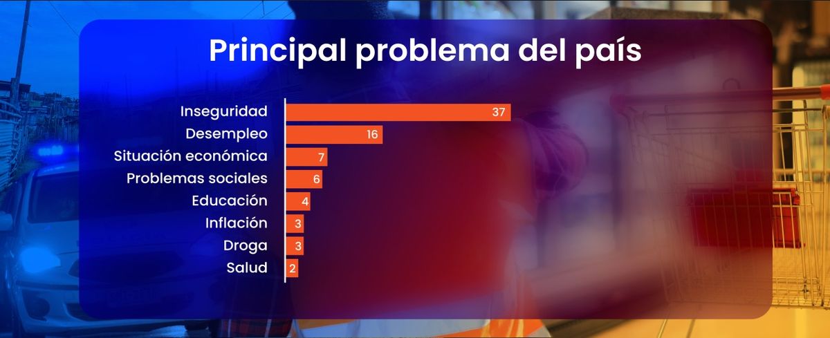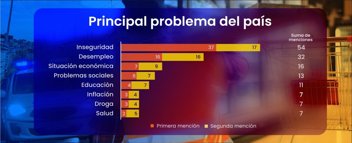 La “inseguridad” es el problema más mencionado, con 37% que lo elige como el más importante y un total de 54% que lo menciona ya sea en primer o segundo lugar. En un segundo plano se encuentra el “desempleo” (32% en suma de menciones), y luego hay un tercer escalón en el que se encuentran en un plano cercano la “situación económica” (16%), los “problemas sociales” (13%), y la “educación” (11%), según la última encuesta de Equipos Consultores.