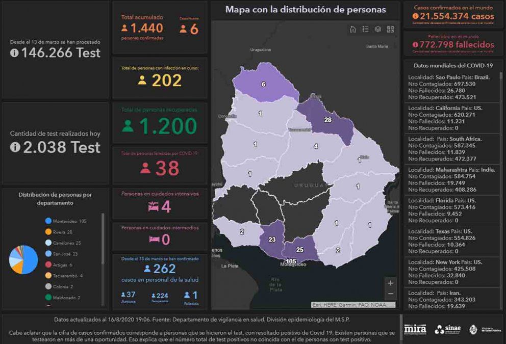 Este domingo se registraron seis casos nuevos de coronavirus Covid-19, lo que da una cifra de positivos acumulados de 1.440 en el territorio desde que comenzó la emergencia sanitaria. De los seis casos, tres corresponden al departamento de Montevideo y tres a Rivera.