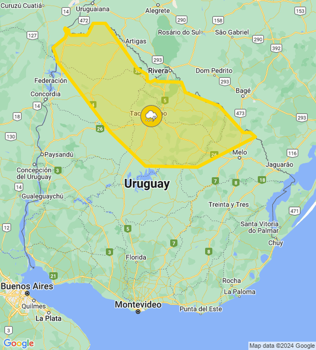 Hay alerta amarilla vigente por tormentas fuertes y lluvias intensas, informó el Instituto Uruguayo de Meteorología (Inumet). Rige hasta las 20:45.