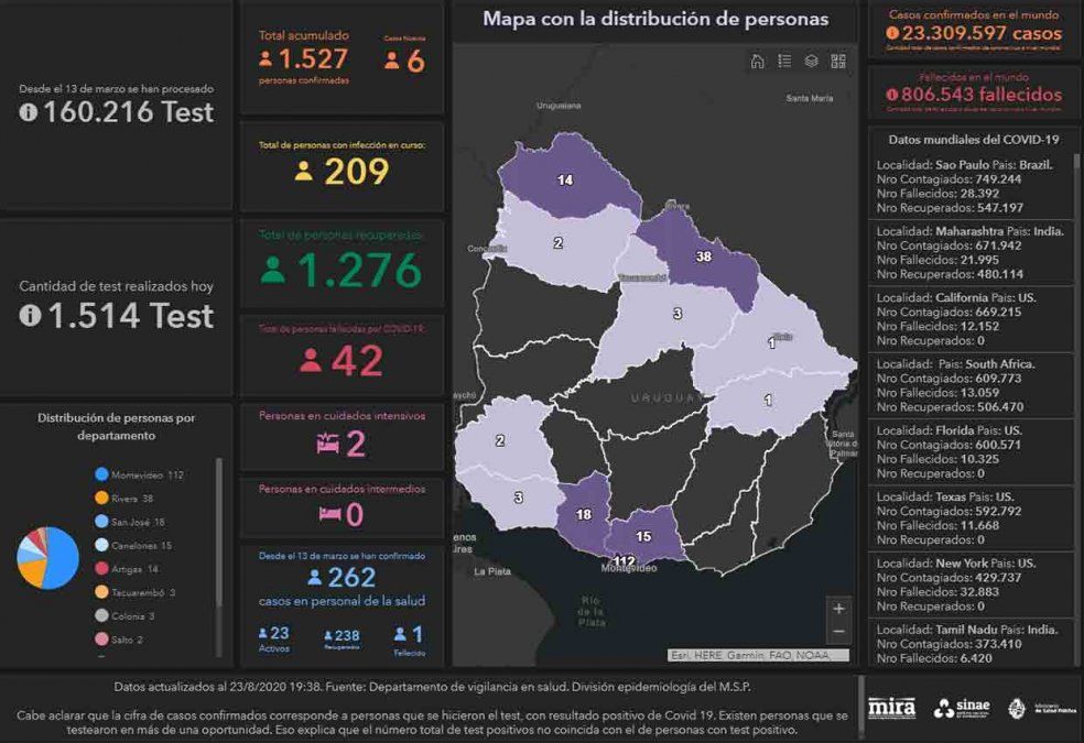 Este domingo se registraron seis casos nuevos de coronavirus Covid-19, lo que da una cifra total de 1.527 casos positivos acumulados desde que comenzó la emergencia sanitaria en el territorio. Cinco de ellos son de Montevideo y uno de San José.
