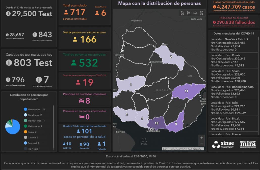 Uruguay sumó este martes seis nuevos casos positivos de coronavirus, lo que da una cifra total de 717 casos registrados desde que comenzó la emergencia sanitaria en el país el 13 de marzo.