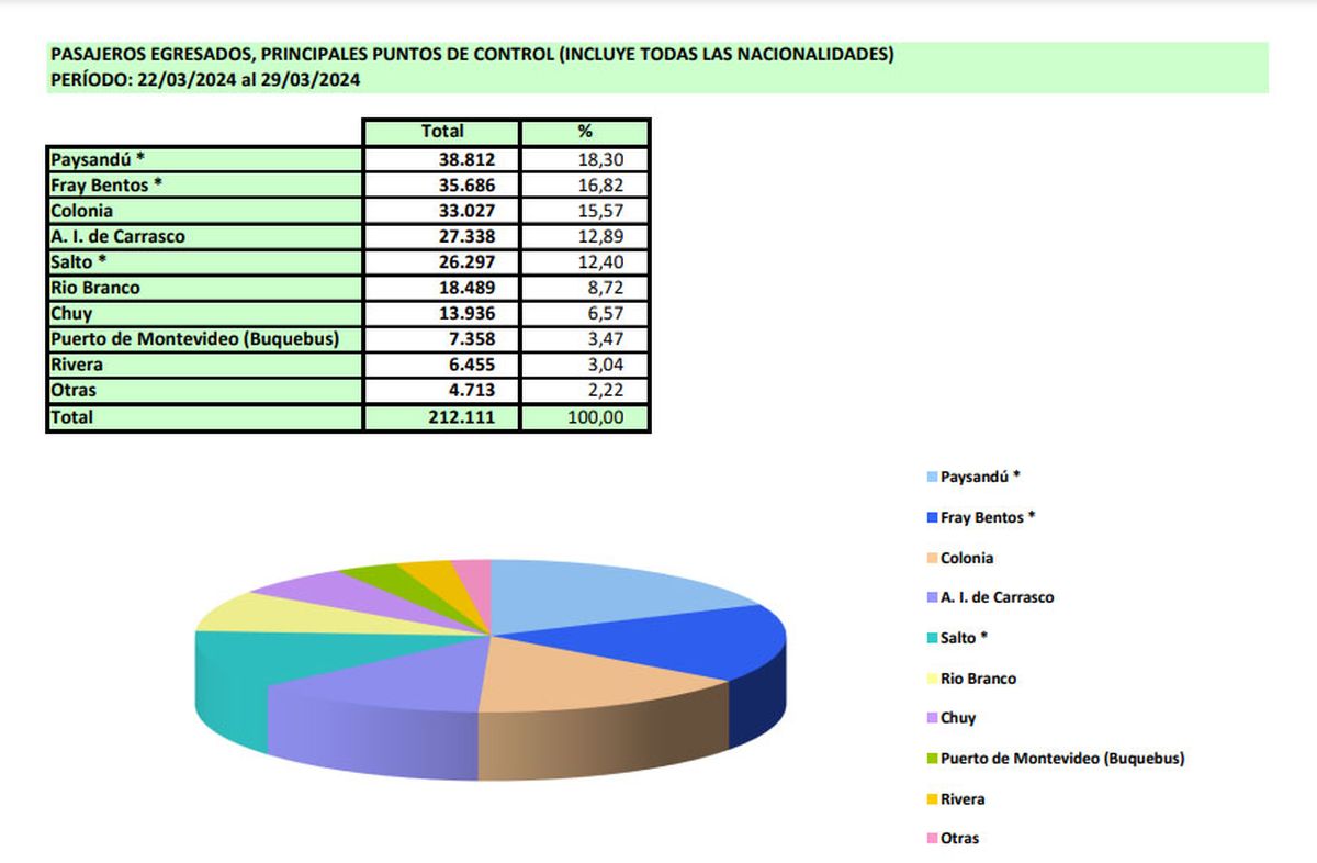 Según los datos que maneja la Dirección de Migración, la mayor cantidad de vehículos cruzó hacia Argentina por los puentes de Paysandú-Colón y Fray Bentos-Puerto Unzué, por lo que allí se espera el regreso masivo de uruguayos. También por el puente Salto-Concordia, pero en menor número, según las cifras de salida durante la Semana de Turismo.