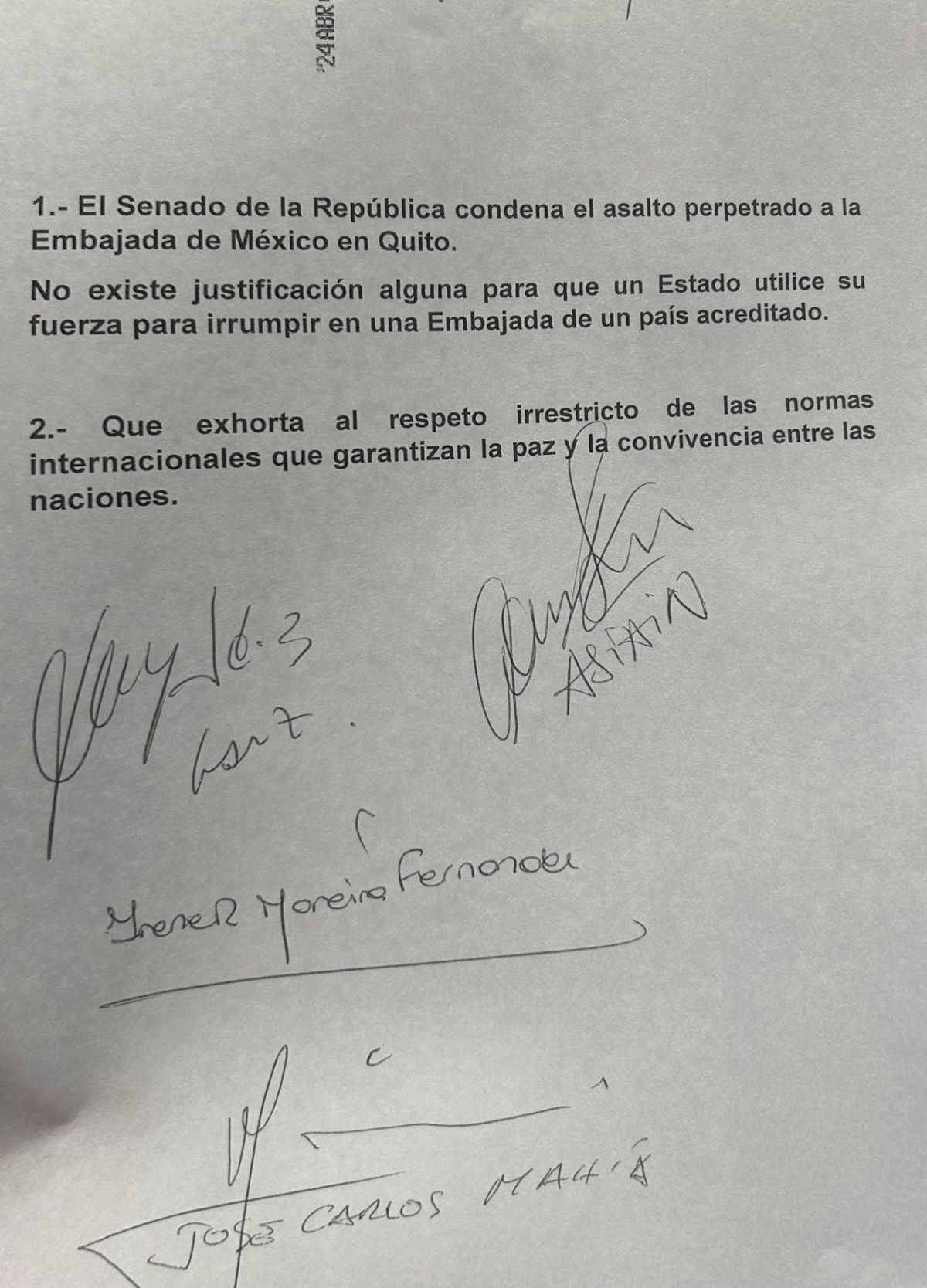 El Senado votó por unanimidad una declaración que “condena el asalto perpetrado a la embajada de México en Quito”, mediante el cual las fuerzas de seguridad de Ecuador detuvieron al exvicepresidente Jorge Glas, quien estaba allí con un asilo político concedido por el gobierno mexicano.
