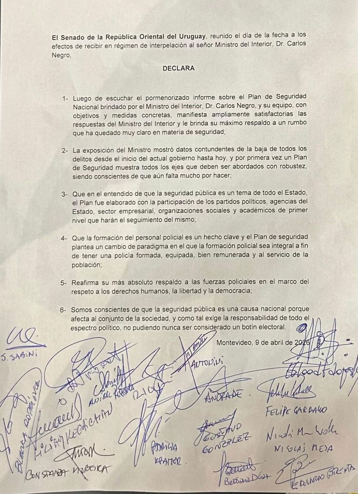 “La exposición del ministro mostró datos contundentes de la baja de todos los delitos desde el inicio del actual gobierno hasta hoy, y por primera vez un plan de seguridad muestra todos los ejes que deben ser abordados con robustez, siendo conscientes de que aún falta mucho por hacer”, agrega la declaración aprobada en el Senado en las primeras horas de este viernes.