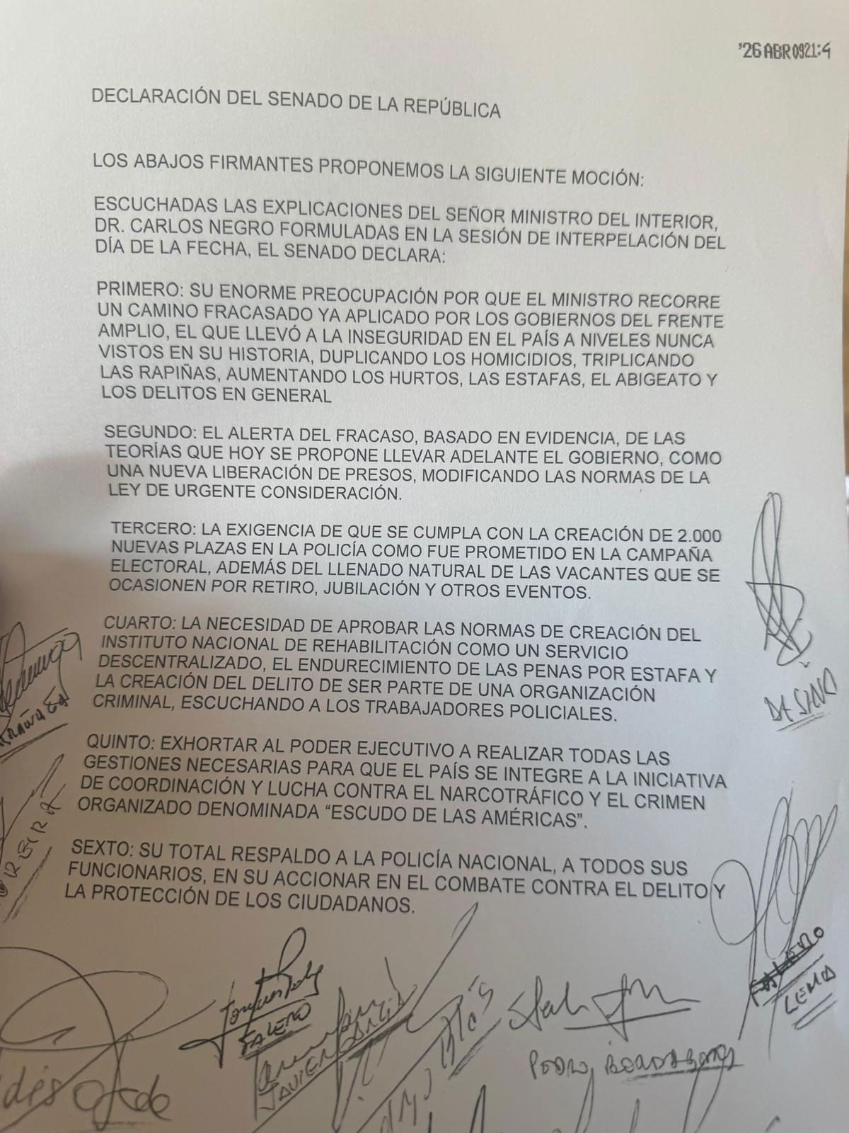 Sobre el final, la bancada de senadores del Frente Amplio (FA) aprobó por mayoría una moción de “máximo respaldo” al ministro y “a un rumbo que ha quedado muy claro en materia de seguridad”.