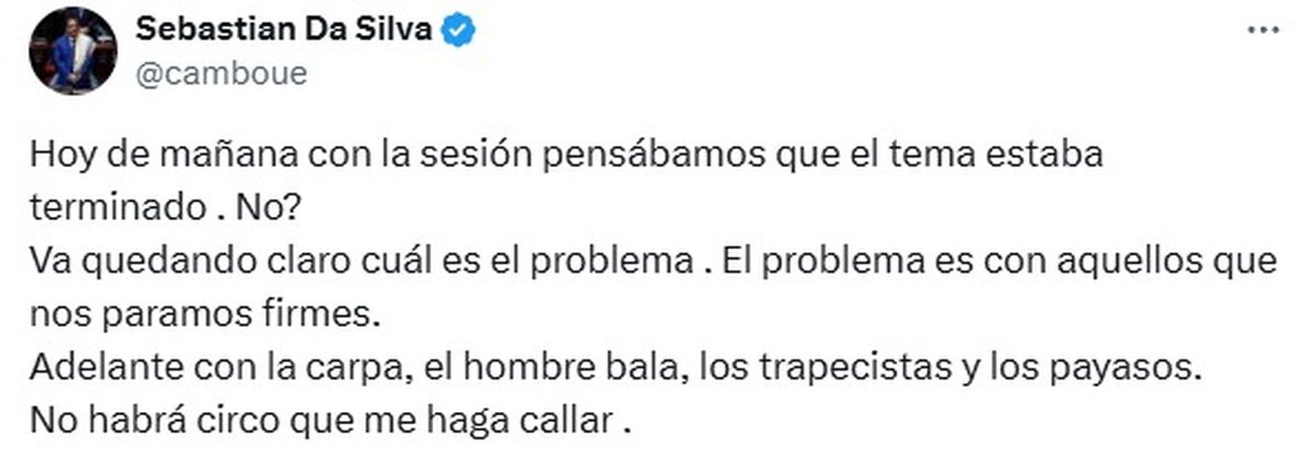 Tras el pedido de los legisladores del Frente Amplio, Da Silva reaccionó en redes sociales. "Hoy de mañana con la sesión pensábamos que el tema estaba terminado. No?", comenzó el nacionalista. "Va quedando claro cuál es el problema. El problema es con aquellos que nos paramos firmes", continuó. "Adelante con la carpa, el hombre bala, los trapecistas y los payasos. No habrá circo que me haga callar", concluyó en X.