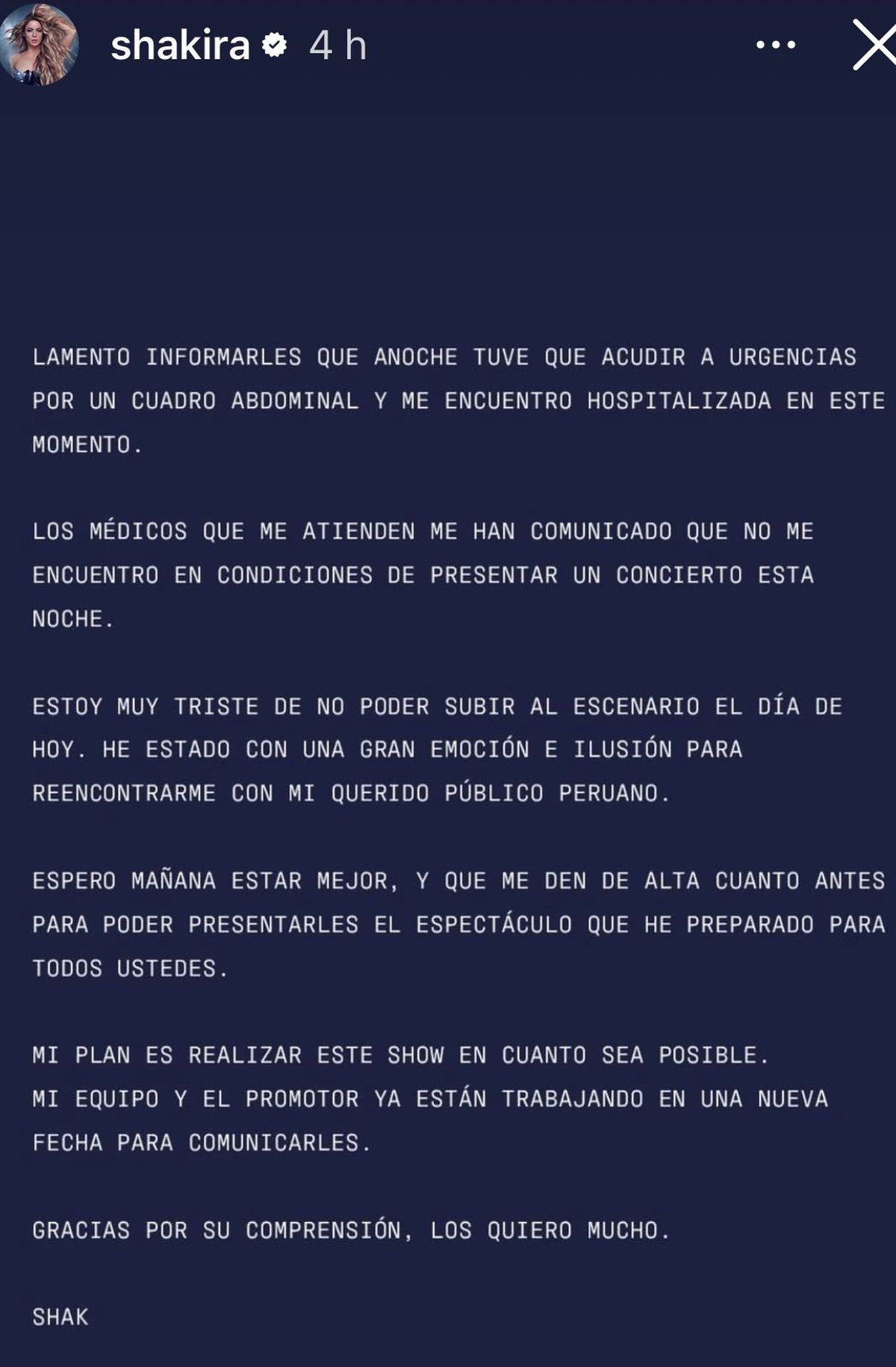"Lamento informarles que anoche tuve que acudir a urgencias por un cuadro abdominal y me encuentro hospitalizada en este momento. Los médicos que me atienden me han comunicado que no me encuentro en condiciones de presentar un concierto esta noche", informó.