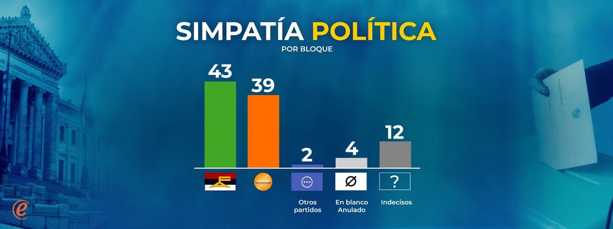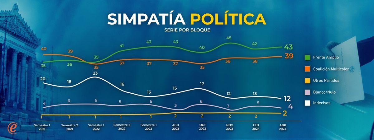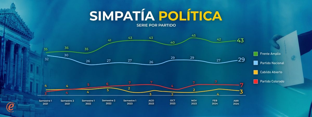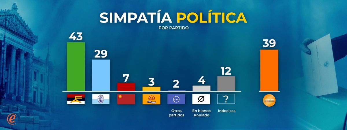 Al terminar abril, “si las elecciones fueran hoy”, 43% de los uruguayos dijo que se inclinaría por el Frente Amplio, 29% por el Partido Nacional, 7% por el Partido Colorado, 3% por Cabildo Abierto, 2% por otros partidos, 4% dijo que votaría en blanco o anulado, y 12% se manifestó indeciso, según la última encuesta de Equipos Consultores.
