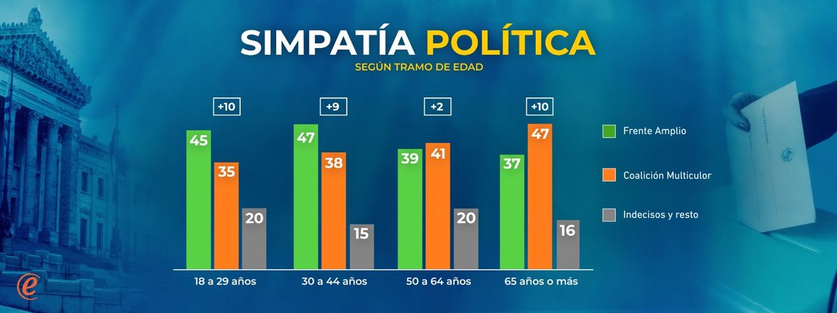 Adicionalmente, también el clivaje etario se aprecia con claridad. Entre los jóvenes, y entre los menores de 45 años el Frente Amplio predomina sobre la Coalición Multicolor, mientras que en los dos tramos de edades mayores la Coalición Multicolor supera al Frente Amplio (con más equilibrio entre los de 50 a 64 y mucho más claramente entre los de 65 y más).
