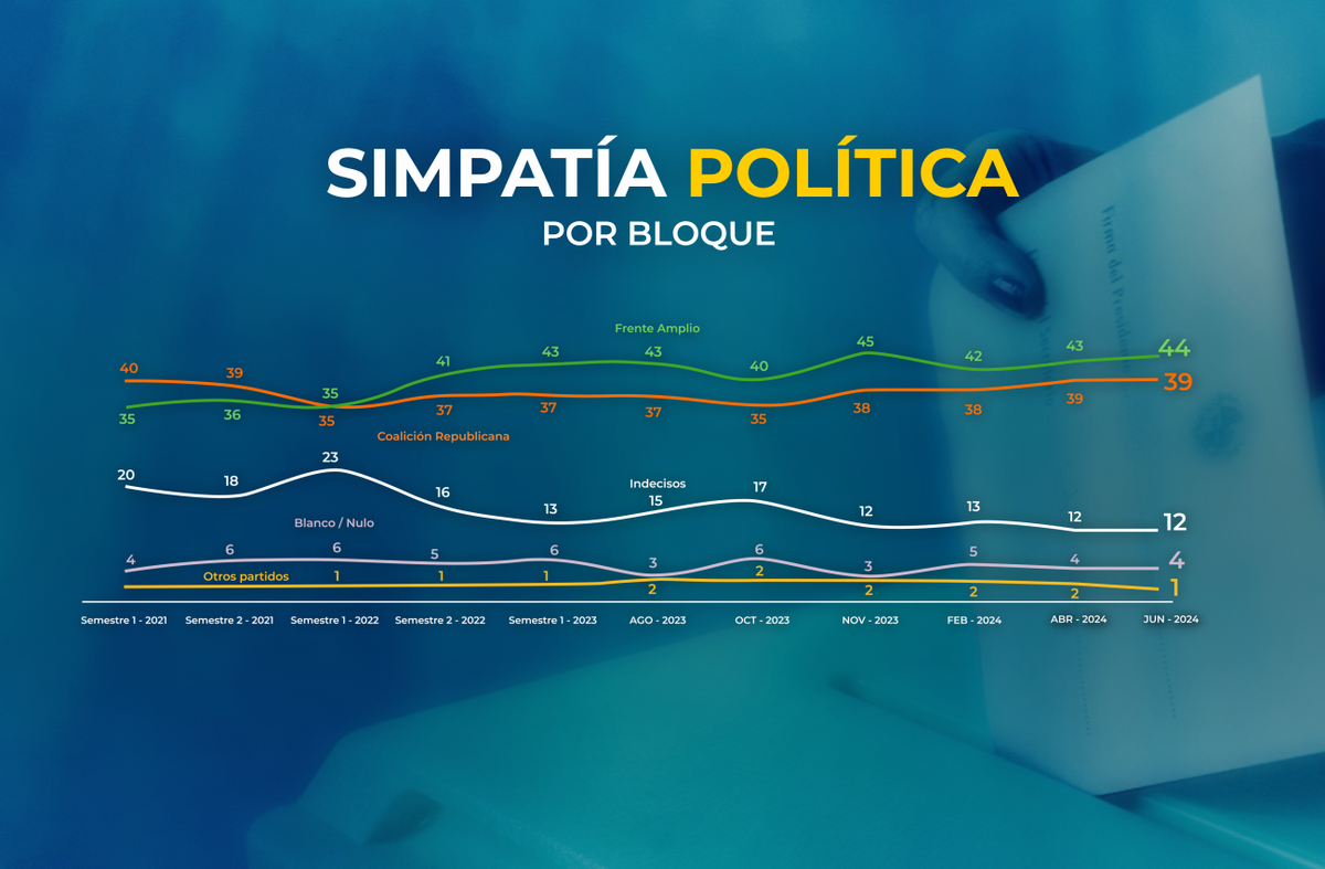 Durante la primera quincena de junio, 44% de los uruguayos dijo que si las elecciones fueran hoy se inclinaría por el Frente Amplio, 26% por el Partido Nacional, 9% por el Partido Colorado, 3% dijo que votaría a Cabildo Abierto y 1% al Partido Independiente. Adicionalmente, otro 1% acumula a otros partidos, 4% se inclina por votar en blanco o anulado y 12% está indeciso, según la última encuesta de Equipos Consultores.