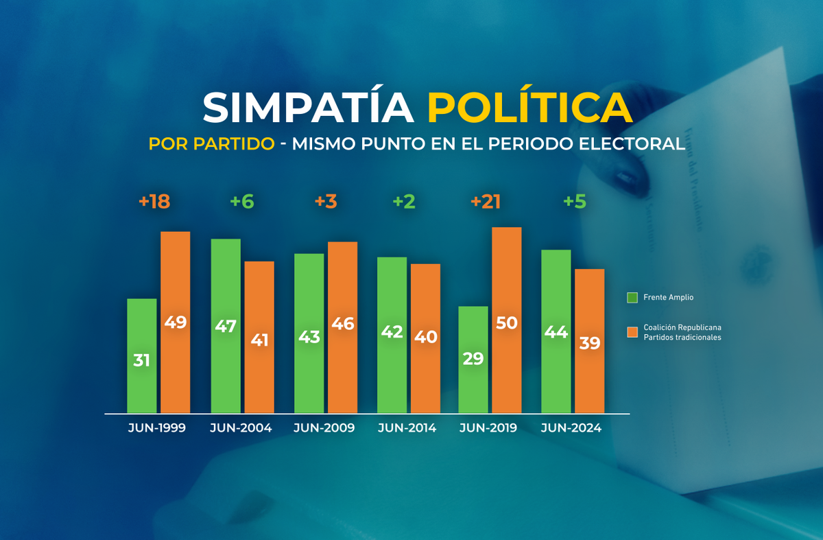 Con estos resultados, el Frente Amplio obtiene una diferencia de 5 puntos sobre la suma de los partidos de la Coalición Multicolor. Es decir, la “foto” al inicio de junio muestra una leve ventaja a favor de la oposición sobre el oficialismo.