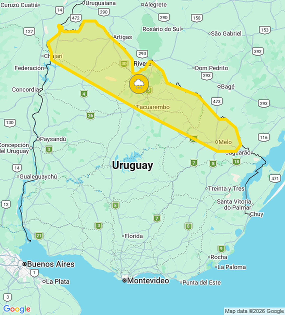 El Inumet mantiene este martes de mañana una advertencia amarilla por la persistencia de de lluvias abundantes en el extremo norte del país (ver mapa).