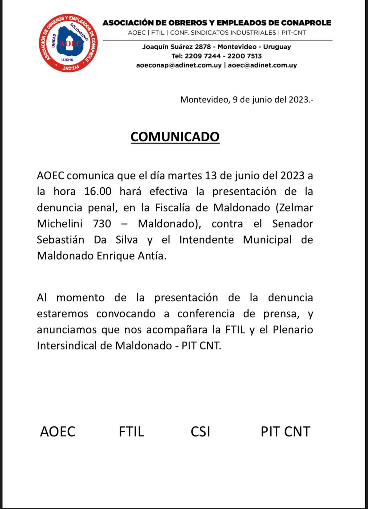 La Asociación de Obreros y Empleados de Conaprole (AOEC) presentará denuncia penal contra el intendente de Maldonado, Enrique Antía, y el senador del Partido Nacional, Sebastián da Silva el próximo martes, ante la Fiscalía de Maldonado.