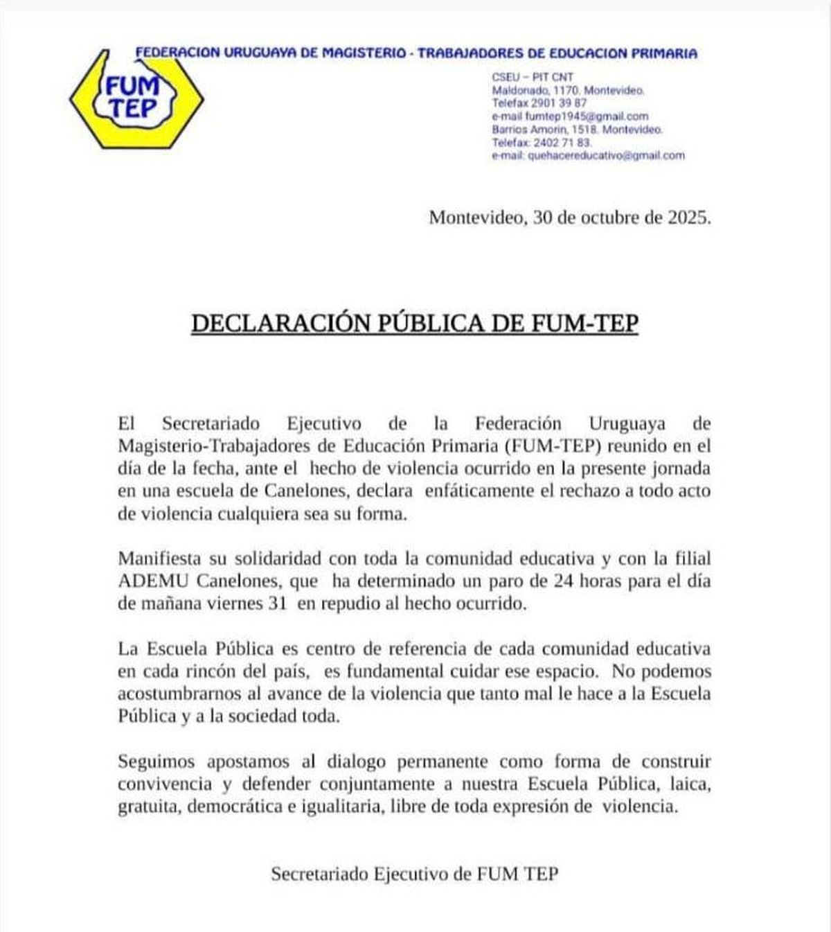 La Federación Uruguaya de Magisterio resolvió realizar un paro de 24 horas este viernes 31 de octubre en repudio de la agresión que sufrieron docentes de una escuela de Canelones.