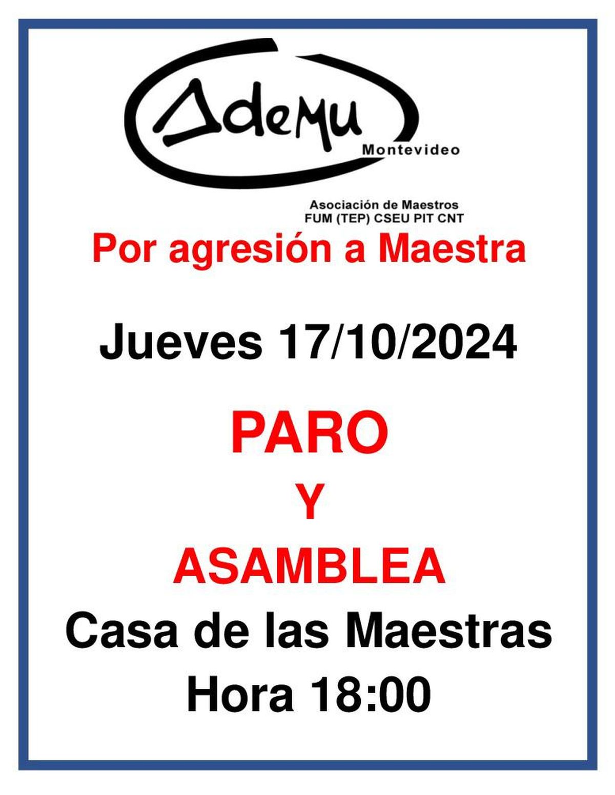 La Asociación de Maestros de Montevideo (Ademu) realizará un paro este jueves en las escuelas del departamento tras la agresión a una docente en Jardines del Hipódromo.