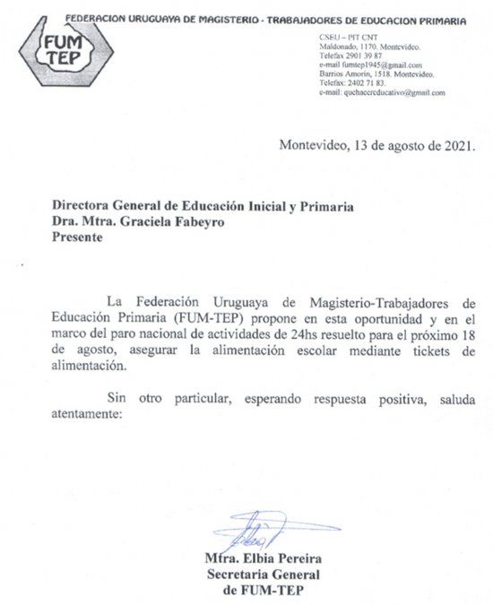 El viernes a última hora la FUM le envió una nota a la directora de Primaria Graciela Fabeyro en la que anuncia la convocatoria al paro y sugiere “asegurar la alimentación escolar mediante tickets de alimentación”.