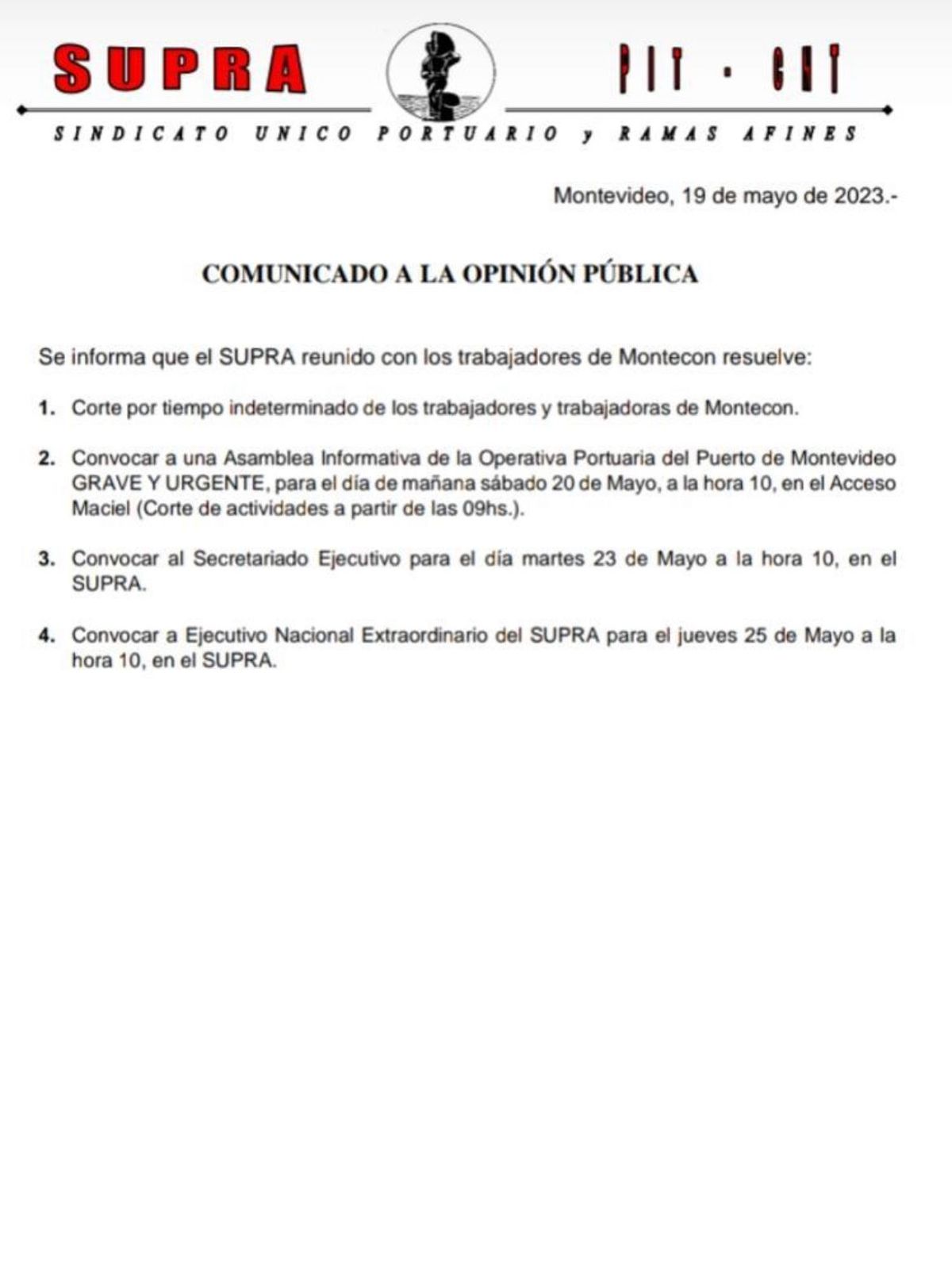 El Sindicato Único Portuario y Ramas Afines emitió este viernes un comunicado donde informa que los trabajadores de Montecon resolvieron cortar las tareas por tiempo indeterminado, además de convocar a una asamblea informativa de la operativa portuaria de carácter "grave y urgente".