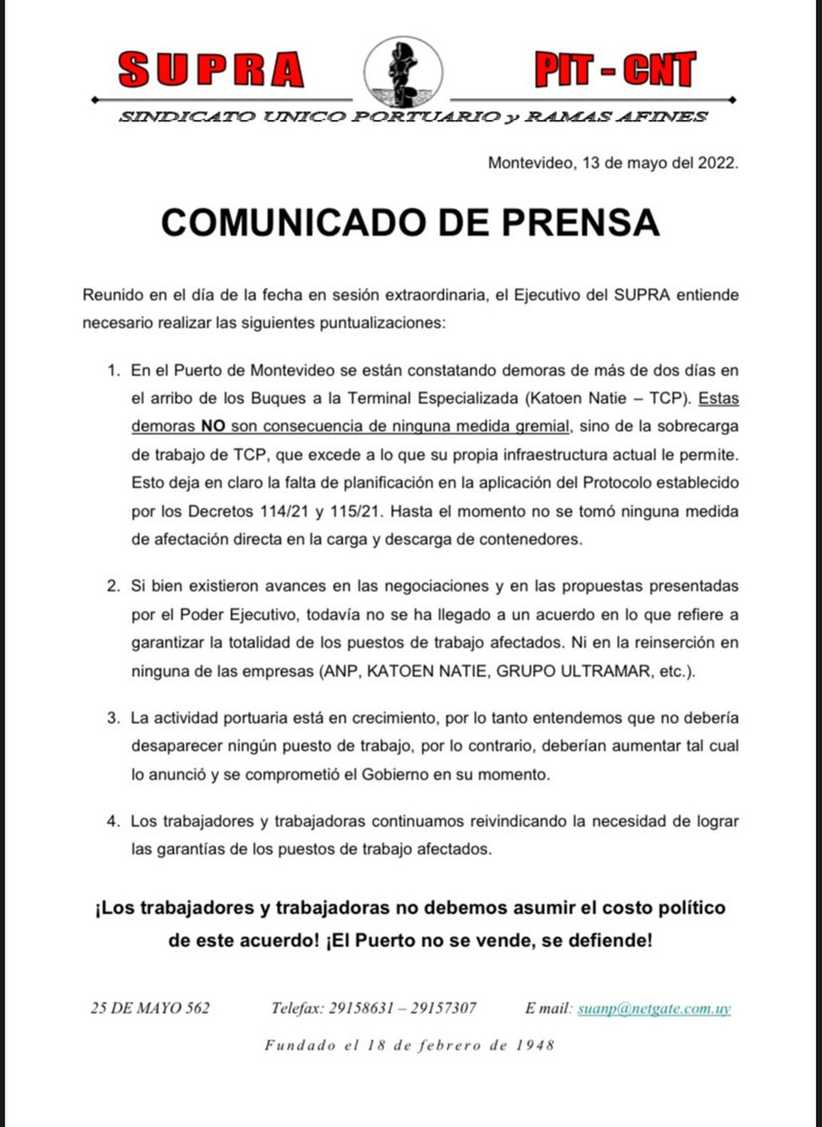 El Sindicato Único Portuario y de Ramas Afines (SUPRA) emitió un comunicado en el que sostiene que las demoras en el puerto a “la sobrecarga de trabajo de TCP ” (Terminal Cuenca del Plata, Katoen Natie). Además, indica que todavía no han tomado medidas que afecten “directamente la carga y descarga de contenedores”.