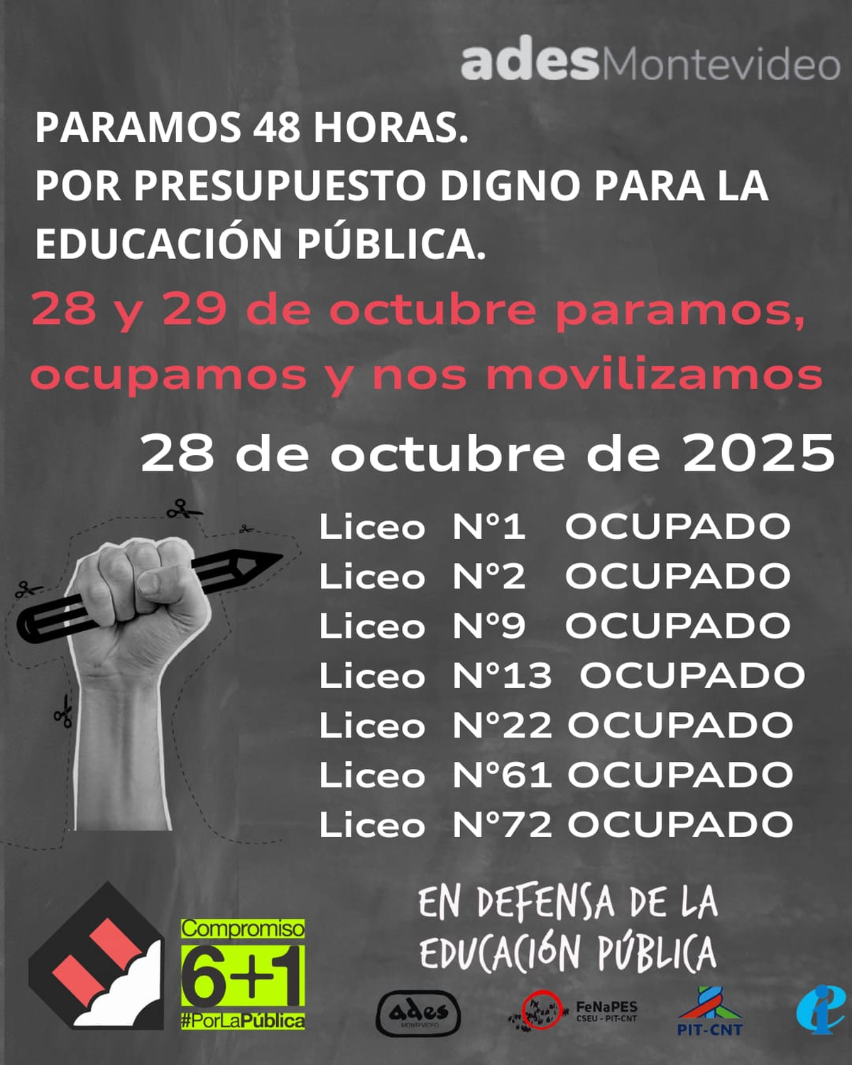 El paro de este martes es por más presupuesto para la educación, y el miércoles se suman al paro del PIT-CNT. El sindicato de profesores ocupa en Montevideo al menos siete liceos.