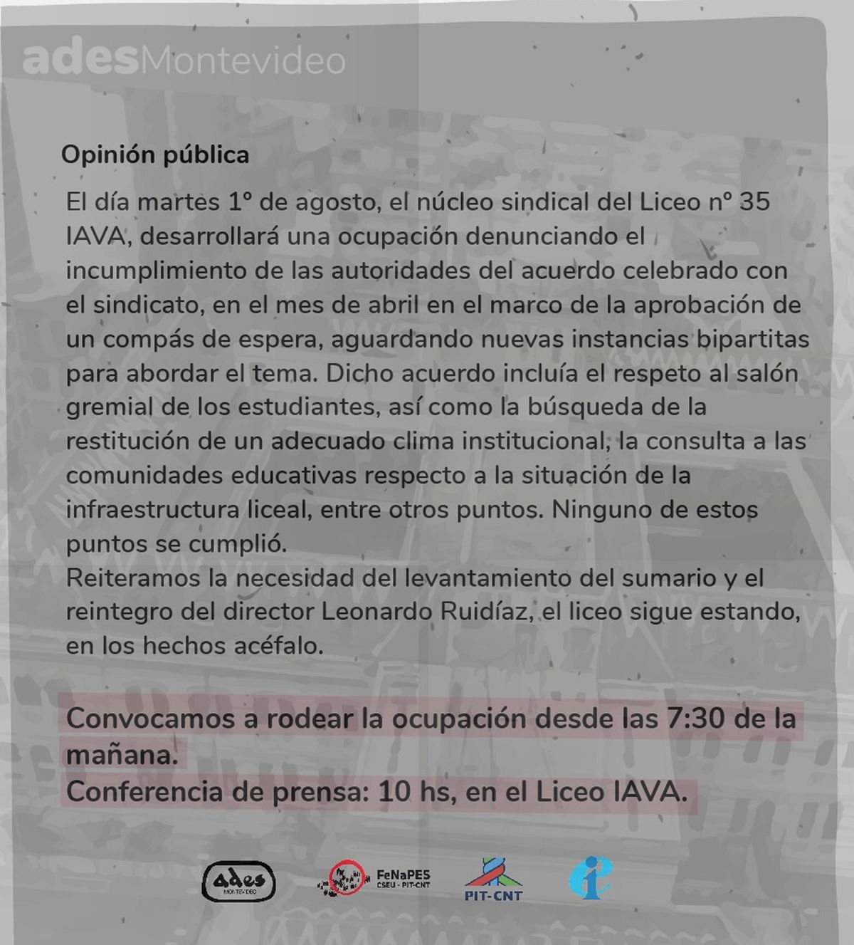 El sindicato de profesores del liceo IAVA de Montevideo ocupó este martes 1° de agosto el centro de estudios y convocó a “rodear la ocupación” desde la hora 7:30.