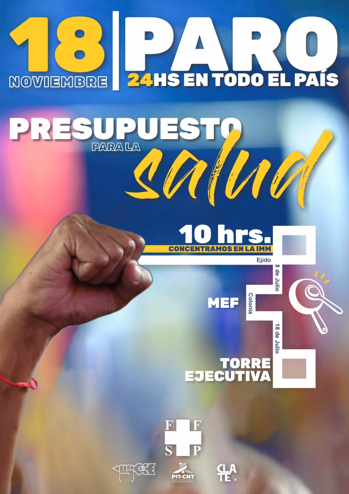 El sindicato de funcionarios de salud pública (FFSP) convoca a un paro de 24 horas este martes en todo el país por reclamo de mayor presupuesto para la salud, entre otras reivindicaciones.