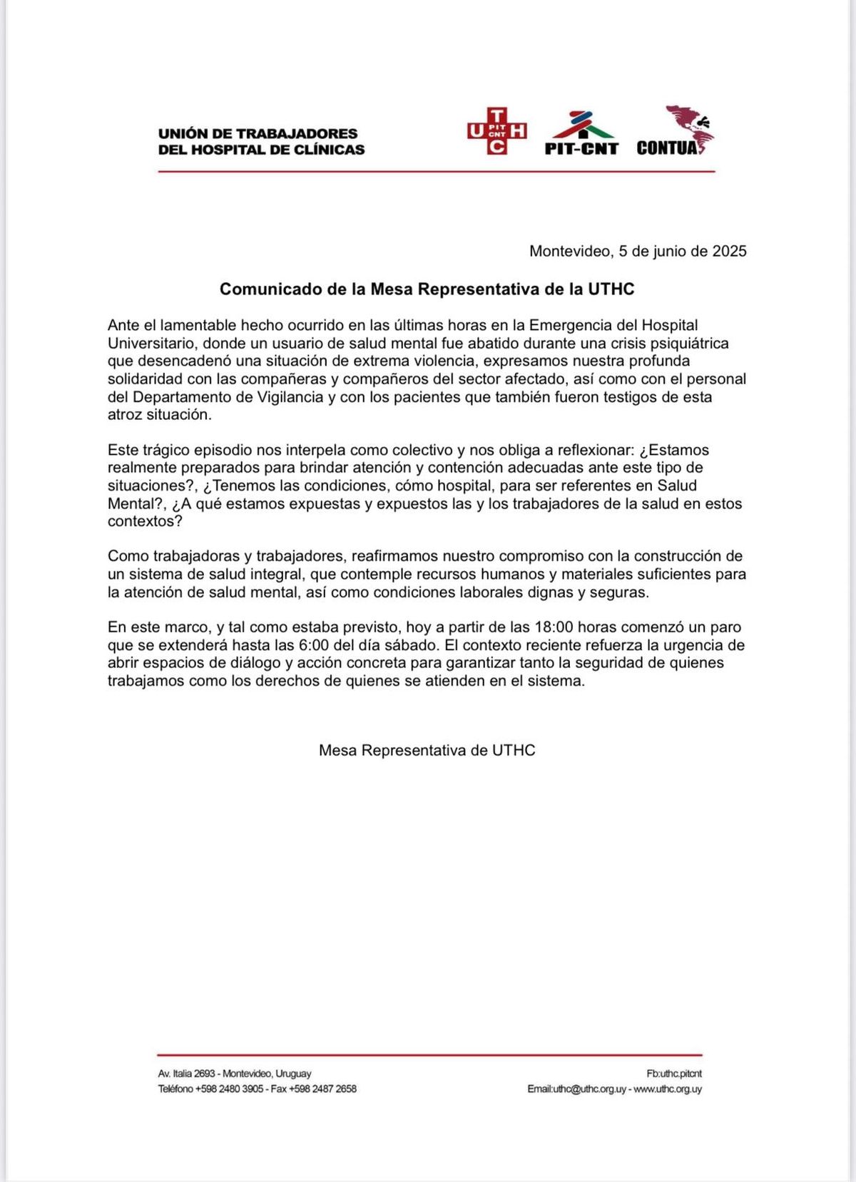 La UTHC reafirmó su compromiso "con la construcción de un sistema de salud integral, que contemple recursos humanos y materiales suficientes para la atención de salud mental, así como condiciones laborales dignas y seguras" y reclamó espacios de diálogo y acciones concretas para garantizar la seguridad de trabajadores y usuarios.