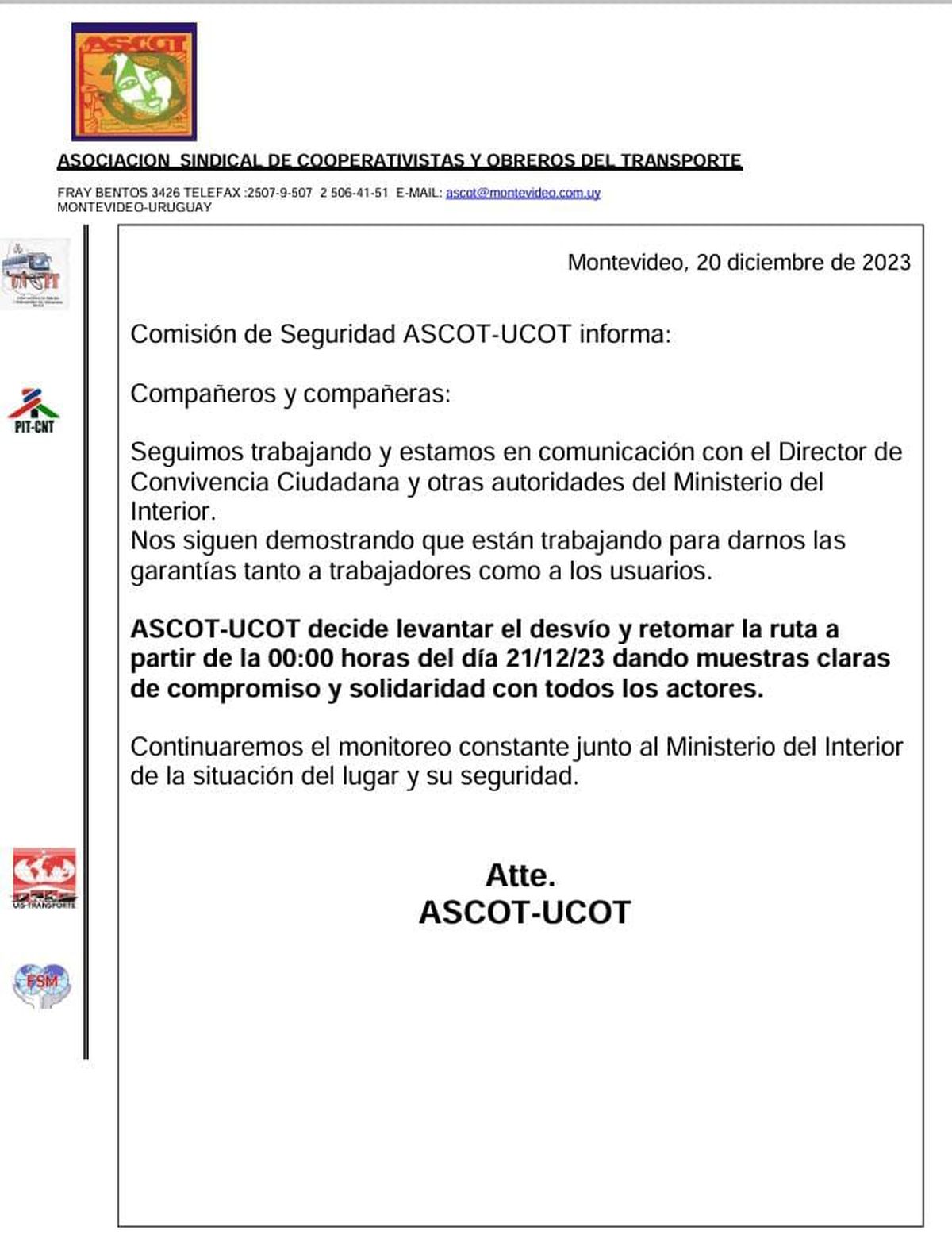 "Seguimos trabajando y estamos en comunicación con el director de Convivencia Ciudadana y otras autoridades del Ministerio del Interior. Nos siguen demostrando que están trabajando para darnos las garantías tanto a trabajadores como a los usuarios", afirma el sindicato en un comunicado, en el que da cuenta que desde la hora cero del 21 de diciembre se levantan los desvíos y se retoma la ruta habitual "dando muestras claras de compromiso y solidaridad con todos los actores".