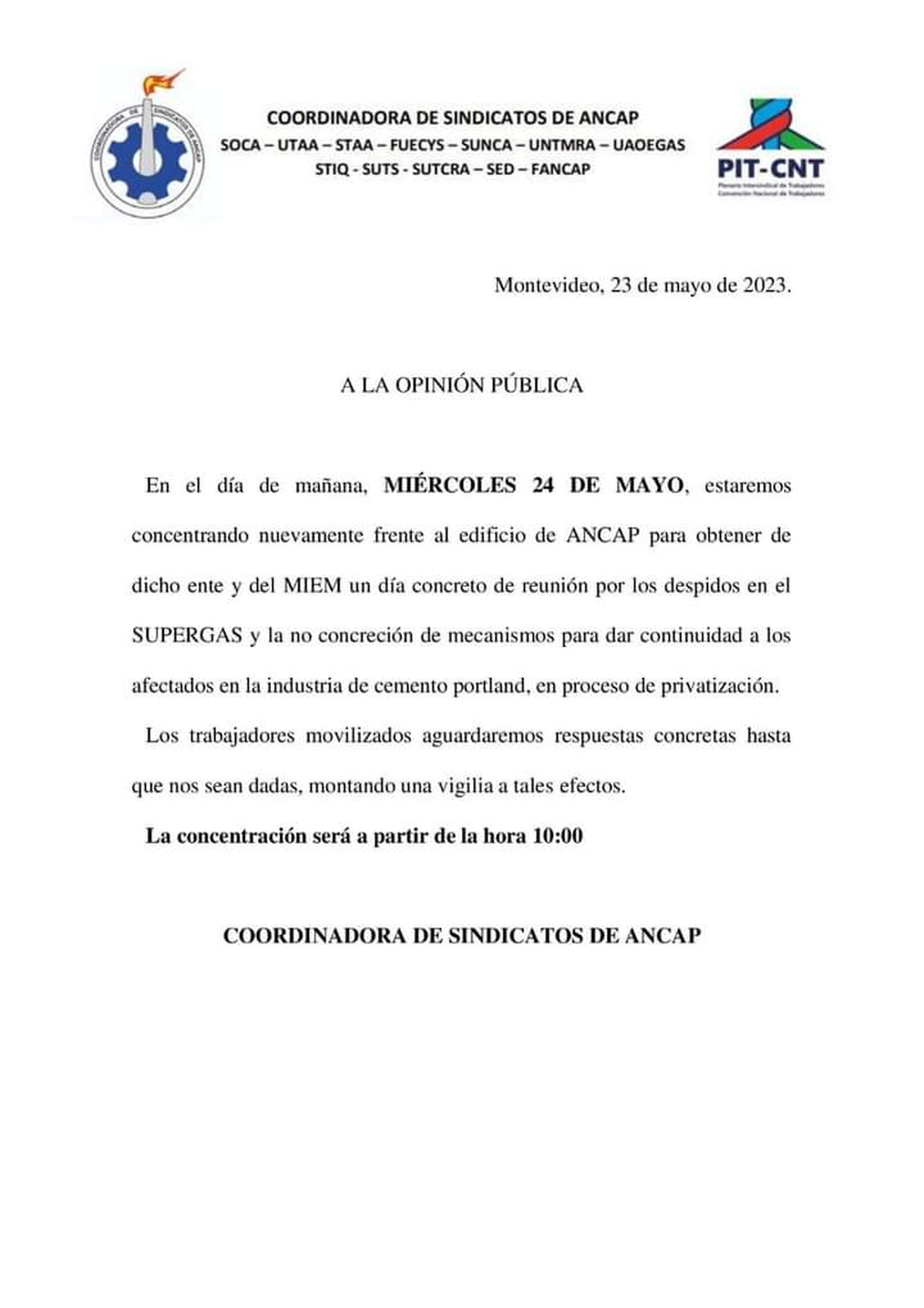 La Coordinadora de Sindicatos de Ancap se concentrará este miércoles en la puerta de la empresa estatal en reclamo por los despidos en el supergás. Allí montan vigilia hasta obtener una reunión con las autoridades.