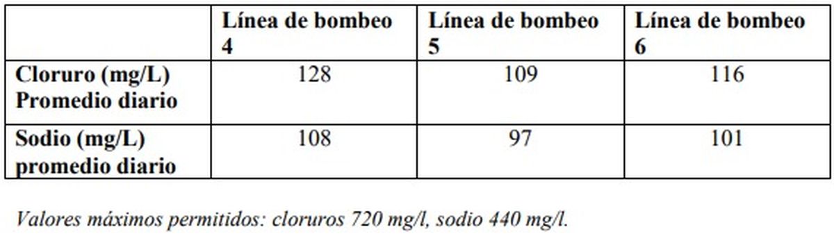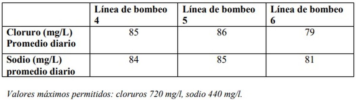 En casi todos los casos, los valores fueron superiores a 100 miligramos por litro de agua. Pese a eso, los registros están muy por debajo de los máximos permitidos por el Ministerio de Salud Pública (MSP) de 720 mg/l para cloruros y de 440 mg/l para sodio.