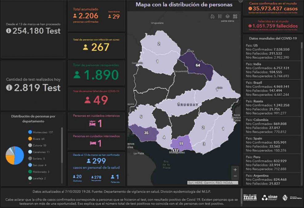 Este miércoles se registraron 29 casos positivos de coronavirus Covid-19, en una base de 2.819 análisis procesados, lo que da una cifra total de 2.206 casos positivos acumulados desde que comenzó la emergencia sanitaria. Del total de casos nuevos, 15 se registraron en el departamento de Montevideo, 10 en Rivera, tres en Colonia y uno en Soriano.