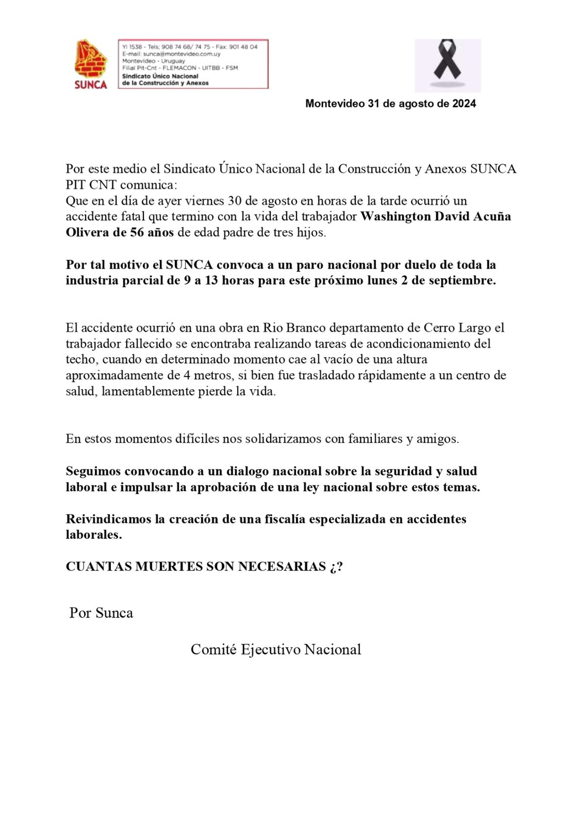 El accidente fatal ocurrió el pasado viernes 30 de agosto. Washington David Acuña Olivera, de 56 años, trabajaba en una obra en la localidad Río Branco, en el departamento de Cerro Largo, cuando en determinado momento cayó al vacío de una altura aproximadamente de 4 metros, indica el comunicado emitido por el sindicato.
