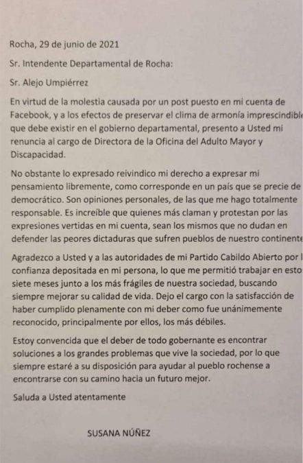Núñez aseguró que fue el intendente Alejo Umpiérrez (Partido Nacional) quien le pidió la renuncia, y procuró dejar afuera de la polémica a su partido, Cabildo Abierto.