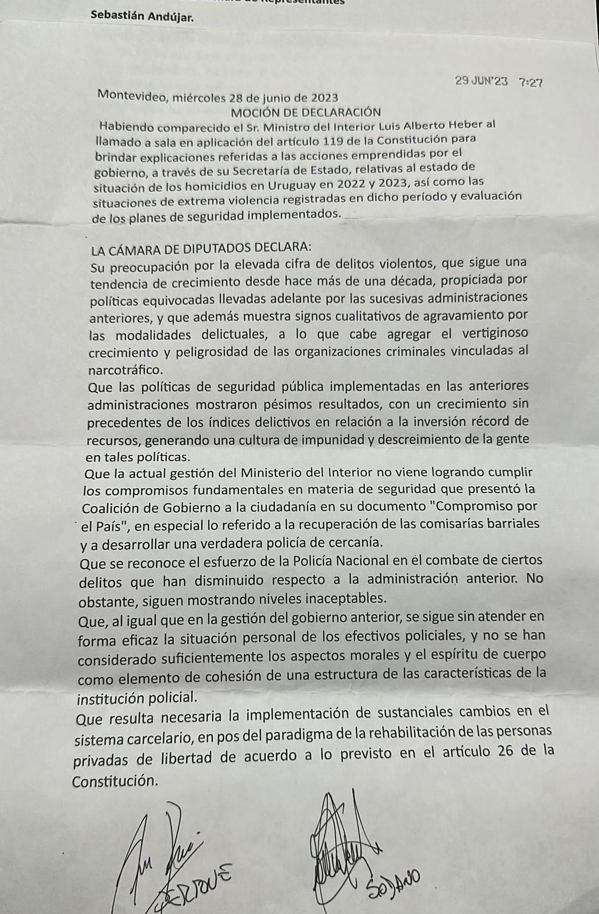 Lo que pasó fue que en ese momento los diputados de Cabildo Abierto Álvaro Perrone y Martín Sodano presentaron una moción por fuera de los partidos de la coalición de gobierno y que en su parte central cuestiona y critica la política de seguridad que lleva adelante la administración del presidente Lacalle Pou desde el Ministerio del Interior.