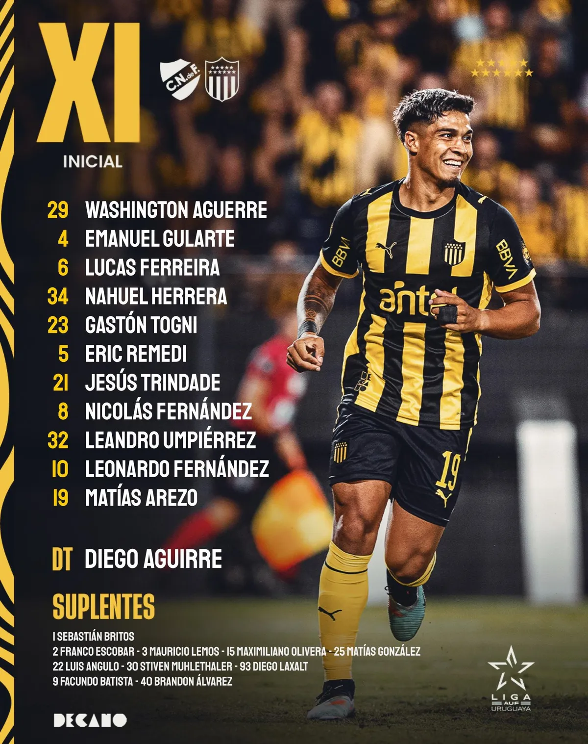 El 11 inicial de Aguirre es con Washington Aguerre, Emanuel Gularte, Lucas Ferreira, Nahuel Herrera, Gastón Togni, Eric Remedi, Jesús Trindade, Nicolás Fernández, Leandro Umpiérrez, Leonardo Fernández, Matías Arezo. Los suplentes son Sebastián Britos, Franco Escobar, Mauricio Lemos, Maximiliano Olivera, Matías González, Luis Angulo, Stiven Muhlethaler, Diego Laxalt, Facundo Batista y Brandon Álvarez.