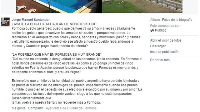 Sus dichos molestaron a Jorge Manuel Santander, asesor del Ministerio de la Jefatura de Gabinete de la provincia de Formosa, quien respondió en su cuenta de Facebook (que borró tras la polémica que se desató).