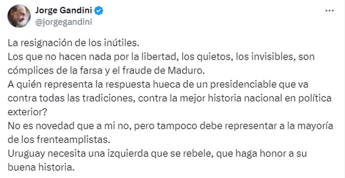 También Gandini se refirió al tema. "La resignación de los inútiles. Los que no hacen nada por la libertad, los quietos, los invisibles, son cómplices de la farsa y el fraude de Maduro. A quién representa la respuesta hueca de un presidenciable que va contra todas las tradiciones, contra la mejor historia nacional en política exterior?", publicó.