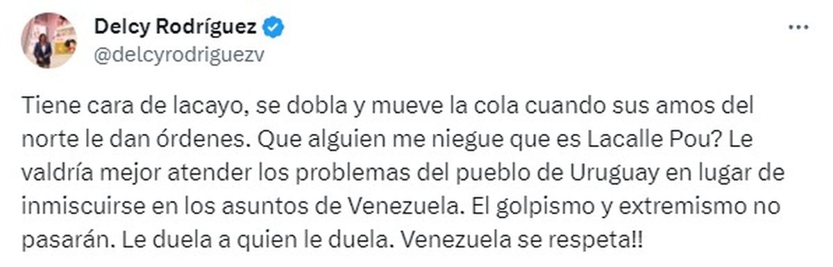 Este lunes, Delcy Rodríguez salió al cruce de los dichos de Lacalle Pou. "Tiene cara de lacayo, se dobla y mueve la cola cuando sus amos del norte le dan órdenes. Que alguien me niegue que es Lacalle Pou? Le valdría mejor atender los problemas del pueblo de Uruguay en lugar de inmiscuirse en los asuntos de Venezuela", expresó Rodríguez en la red social X. "El golpismo y extremismo no pasarán. Le duela a quien le duela. Venezuela se respeta!!", acotó.