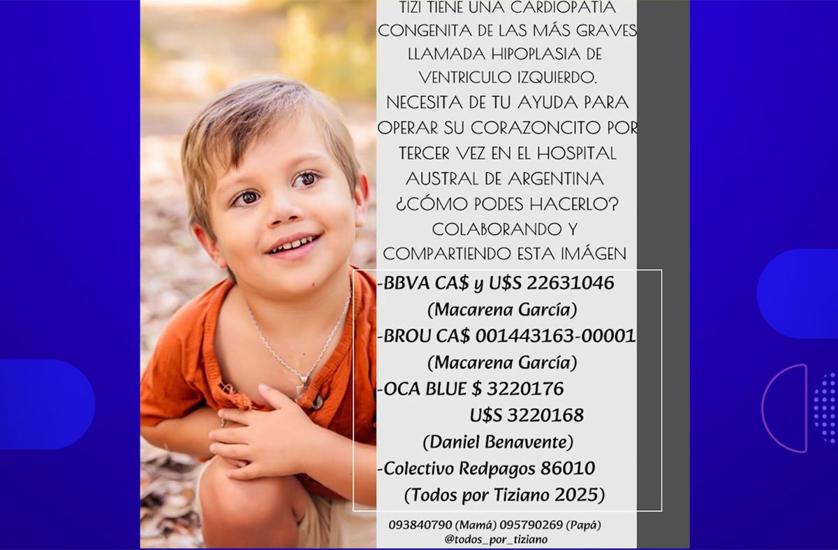 El pequeño ya fue sometido a dos operaciones. La familia requiere reunir el dinero para intervenirlo en Argentina a inicios de abril. Las cuentas para ayudar en @todos_por_tiziano