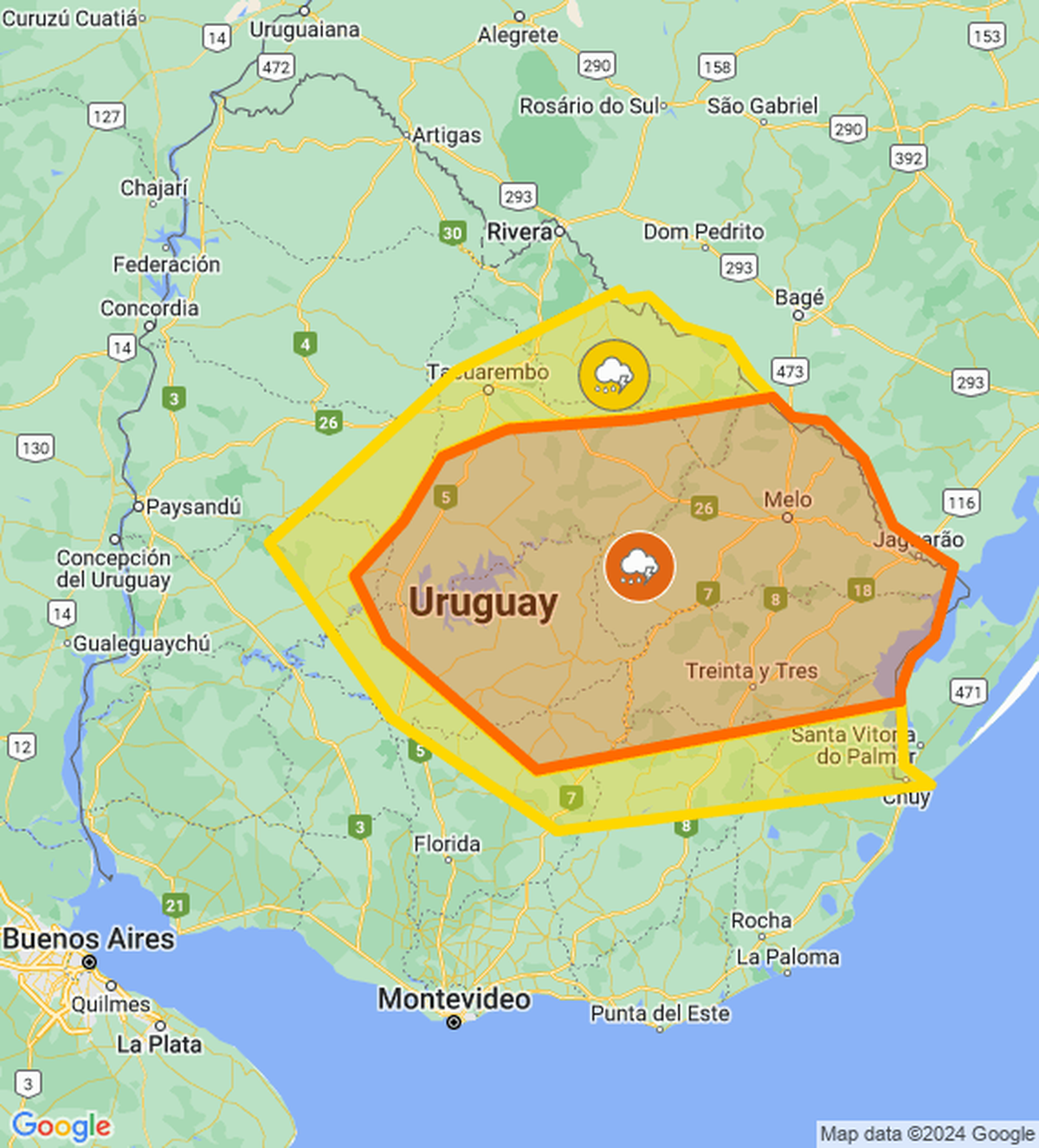 El Instituto Uruguayo de Meteorología volvió a actualizar la doble alerta por tormentas fuertes y lluvias intensas, que ahora rige para menos localidades. Está vigente hasta las 19:00 horas, aunque puede actualizarse ante eventuales cambios.