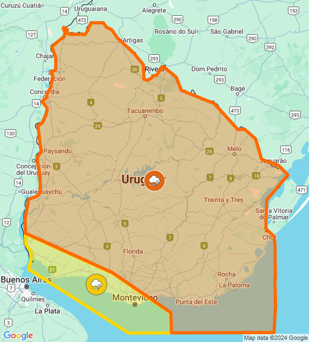 Doble alerta naranja y amarilla por tormentas y lluvias fue actualizada por el Instituto Uruguayo de Meteorología (Inumet), que la extendió para todo el país.