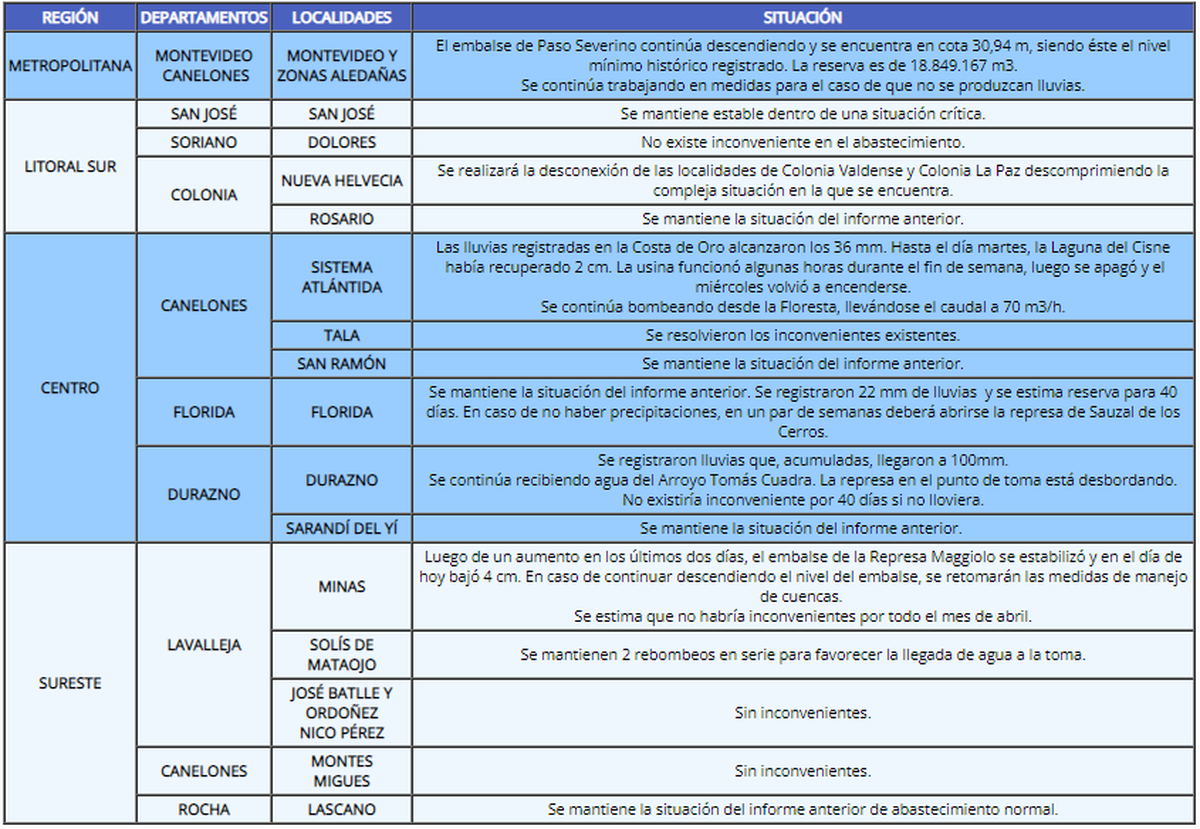 De no llover, en Florida y Durazno hay agua por 40 días. En Montevideo, la situación es la siguiente: "El embalse de Paso Severino continúa descendiendo y se encuentra en cota 30,94 m, siendo éste el nivel mínimo histórico registrado. La reserva es de 18.849.167 m3. Se continúa trabajando en medidas para el caso de que no se produzcan lluvias".