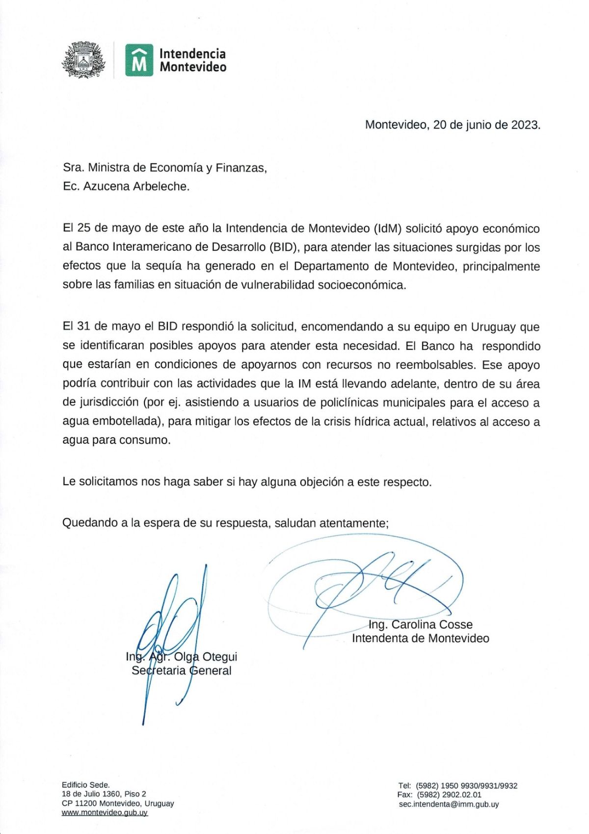 Por cuestiones de formalidad, la intendenta de Montevideo, Carolina Cosse, y la secretaria general de la comuna, Olga Otegui, remitieron una carta a la ministra de Economía y Finanzas, Azucena Arbeleche, para que plantee “si hay alguna objeción” a que la IMM reciba el apoyo del BID.