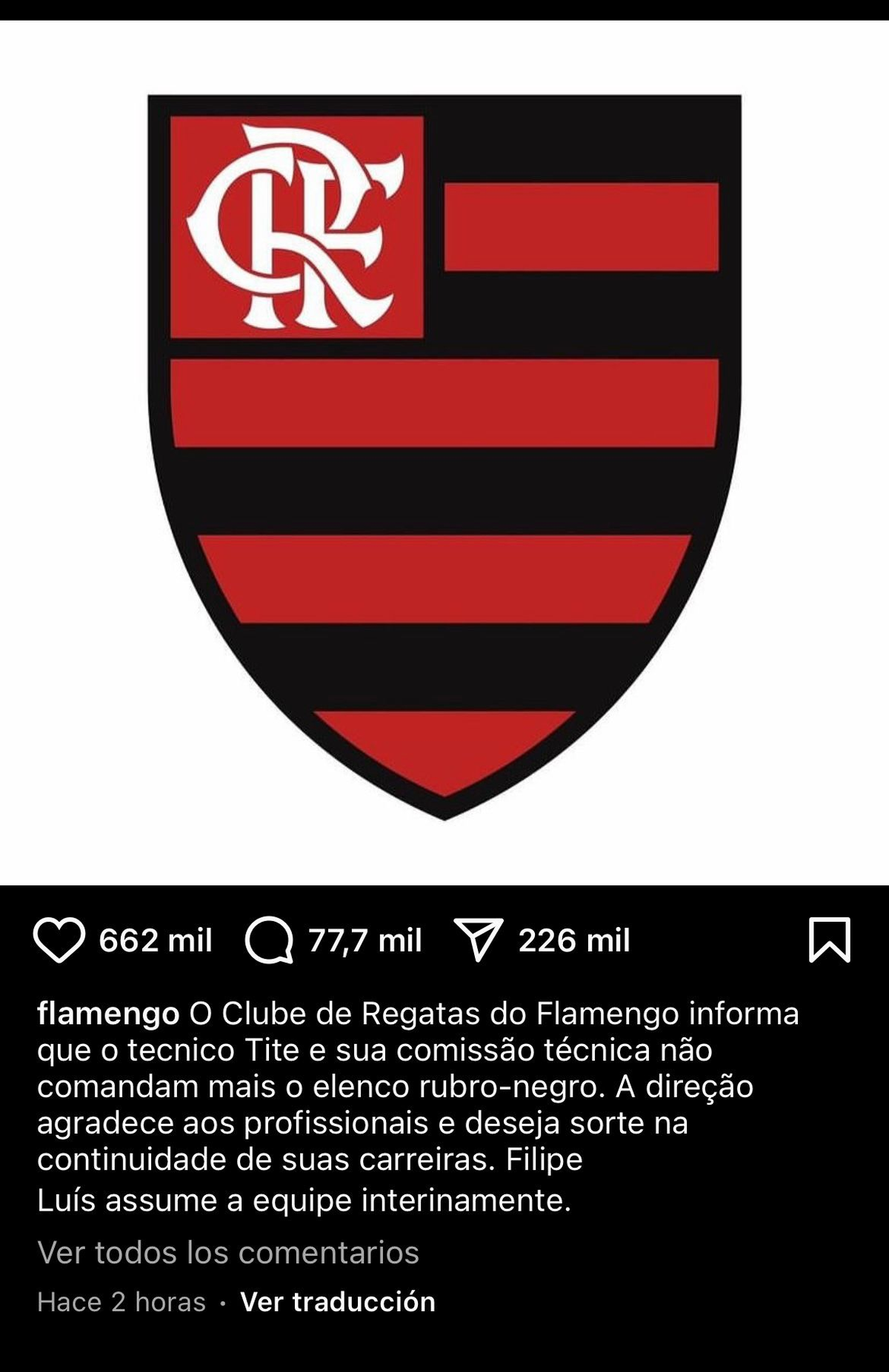 "El Clube de Regatas do Flamengo informa que el técnico Tite y su comité técnico ya no dirigen la plantilla rojinegro. La dirección agradece a los profesionales y les desea suerte en la continuación de su carrera. Filipe Luís se hace cargo del equipo de forma interina", anunció Flamengo en su cuenta de Instagram.