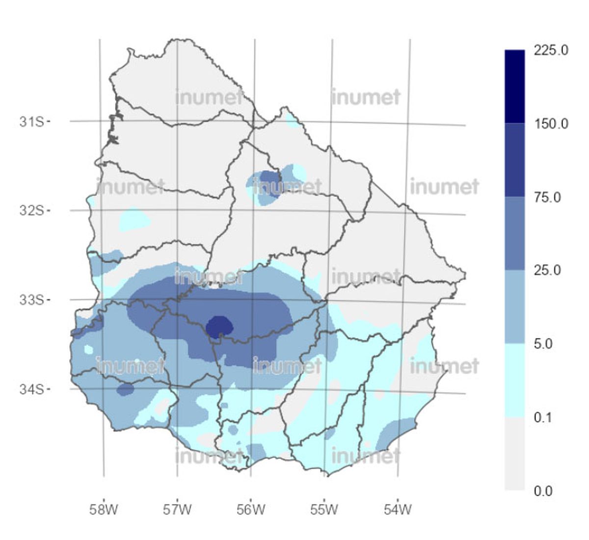 Los mapas de lluvia publicados por el Inumet muestras de forma gráfica dónde llovió más. Se observa que de viernes y sábado hasta el domingo y la mañana del lunes, las precipitaciones se concentraron en el sur del país, en zonas donde se esperaba el agua para aliviar en algo los efectos de la sequía.