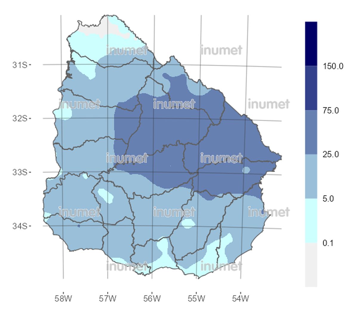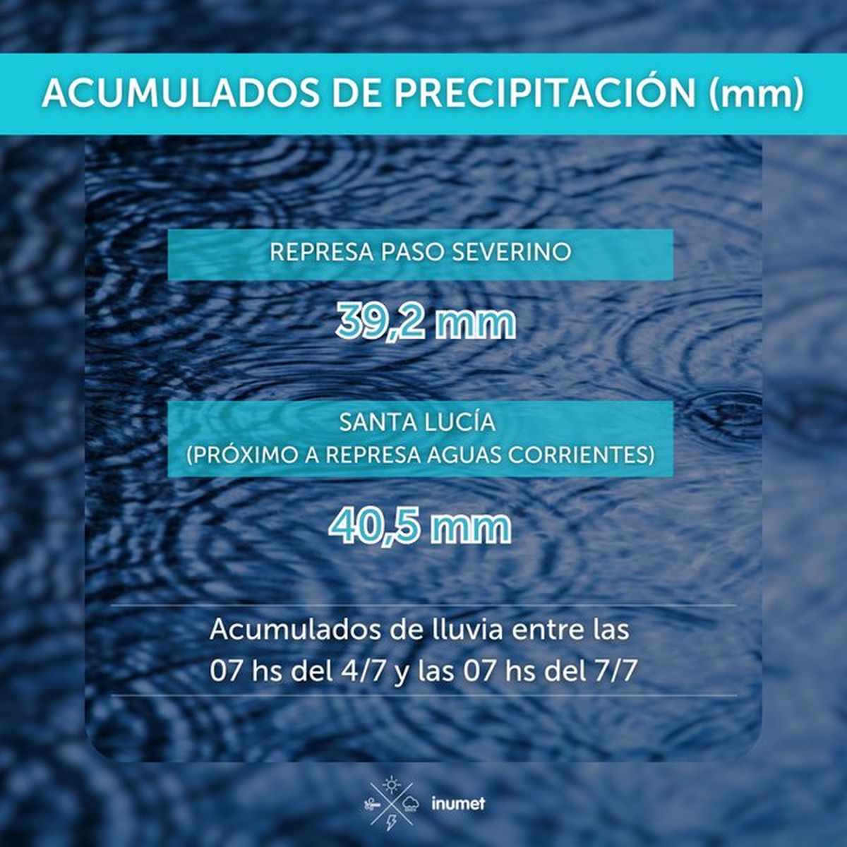 En ese mismo período de tres días, el acumulado de lluvias sobre Paso Severino fue de 39,2 mm, mientras que en el río Santa Lucía, próximo a la represa de Aguas Corrientes, el acumulado fue de 40,5 mm.