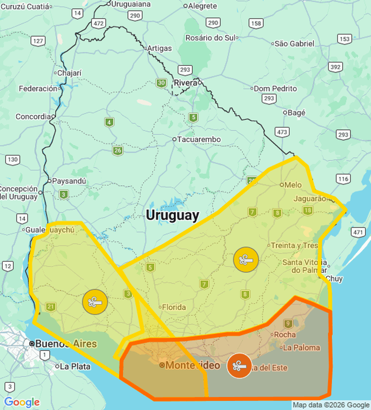 Desde las 21:00 horas, y en principio hasta las 00:00, estará vigente una advertencia de color amarillo que abarca a localidades del suroeste del país. Para ese momento se espera que una depresión atmosférica comience a profundizarse y genere vientos sostenidos de entre 40 y 60 kilómetros por hora, pero que incluso puedan alcanzar los 60 y 80 kilómetros por hora.