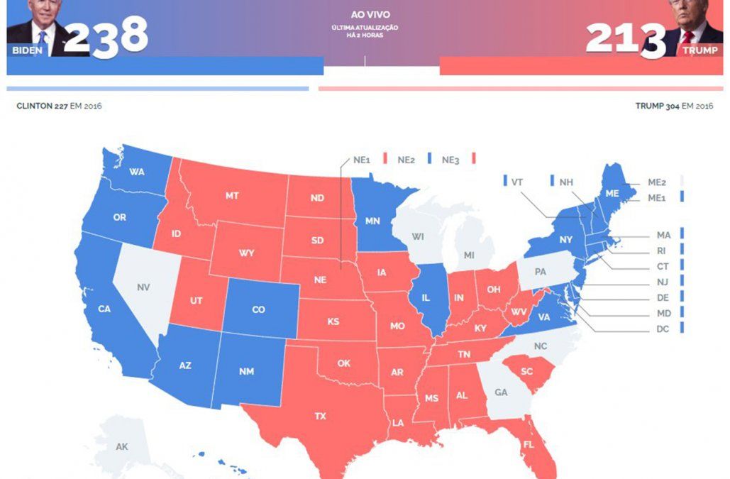El resultado parcial muestra 238 delegados para Biden y 213 para Trump en el colegio electoral. Para vencer es necesario de 270 delegados.
