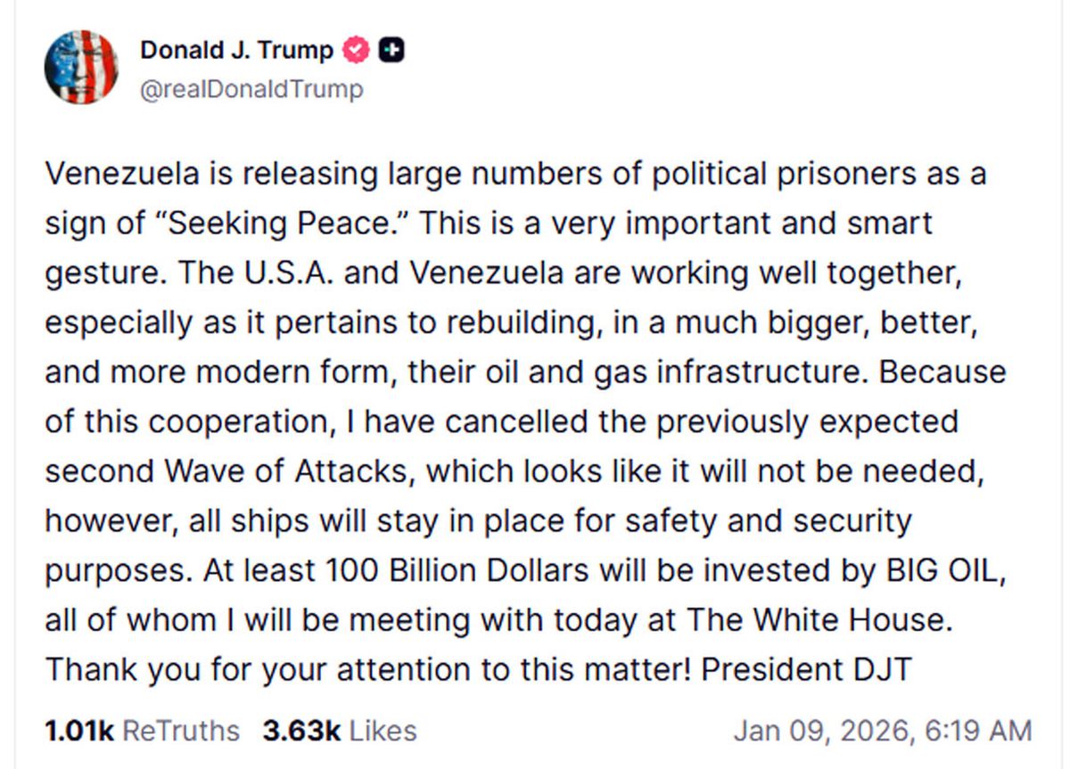 "Venezuela está liberando grandes cantidades de presos políticos como señal de que están 'Buscando la Paz' (...) por esta cooperación he cancelado la segunda oleada de ataques esperada", escribió el presidente en un mensaje publicado en la plataforma Truth.